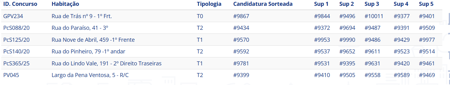 São admitidos a sorteio os candidatos com candidatura validada a aguardar seleção de imóveis e que tenham selecionado as habitações que lhes convenham.